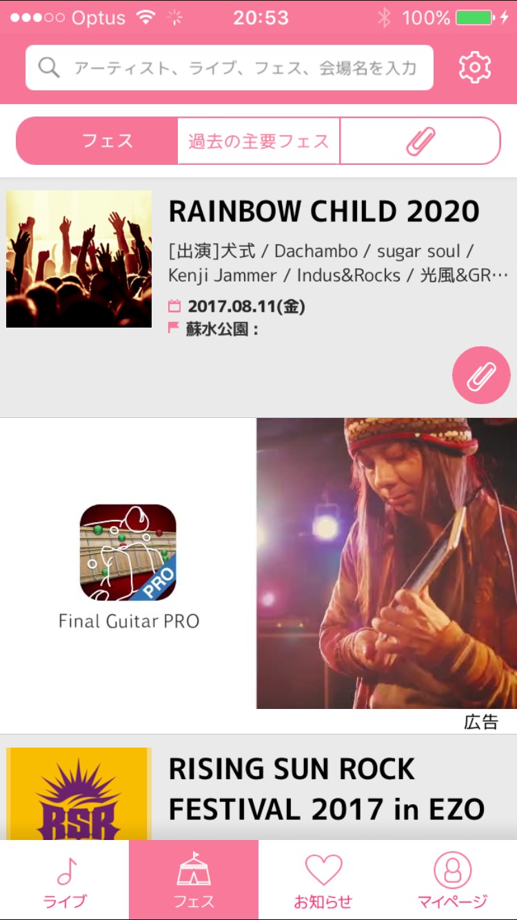 下の方にある「フェス」のボタンをタップすると様々なフェス情報がずらりと表示されます。これから開催されるものから過去に行われたフェスもチェックできるので、どんなものがあるのか見ることができます。フェスのタイトルが表示されている右下の方にクリップマークがあり、そこをタップすると登録されます。登録されたフェス情報は上の方にあるクリップマークをタップすると見ることができます。そのため後からフェスの情報を見たいときにすぐに見れるようになっています。クリップを再度タップすると登録したリストから消すこともできます。