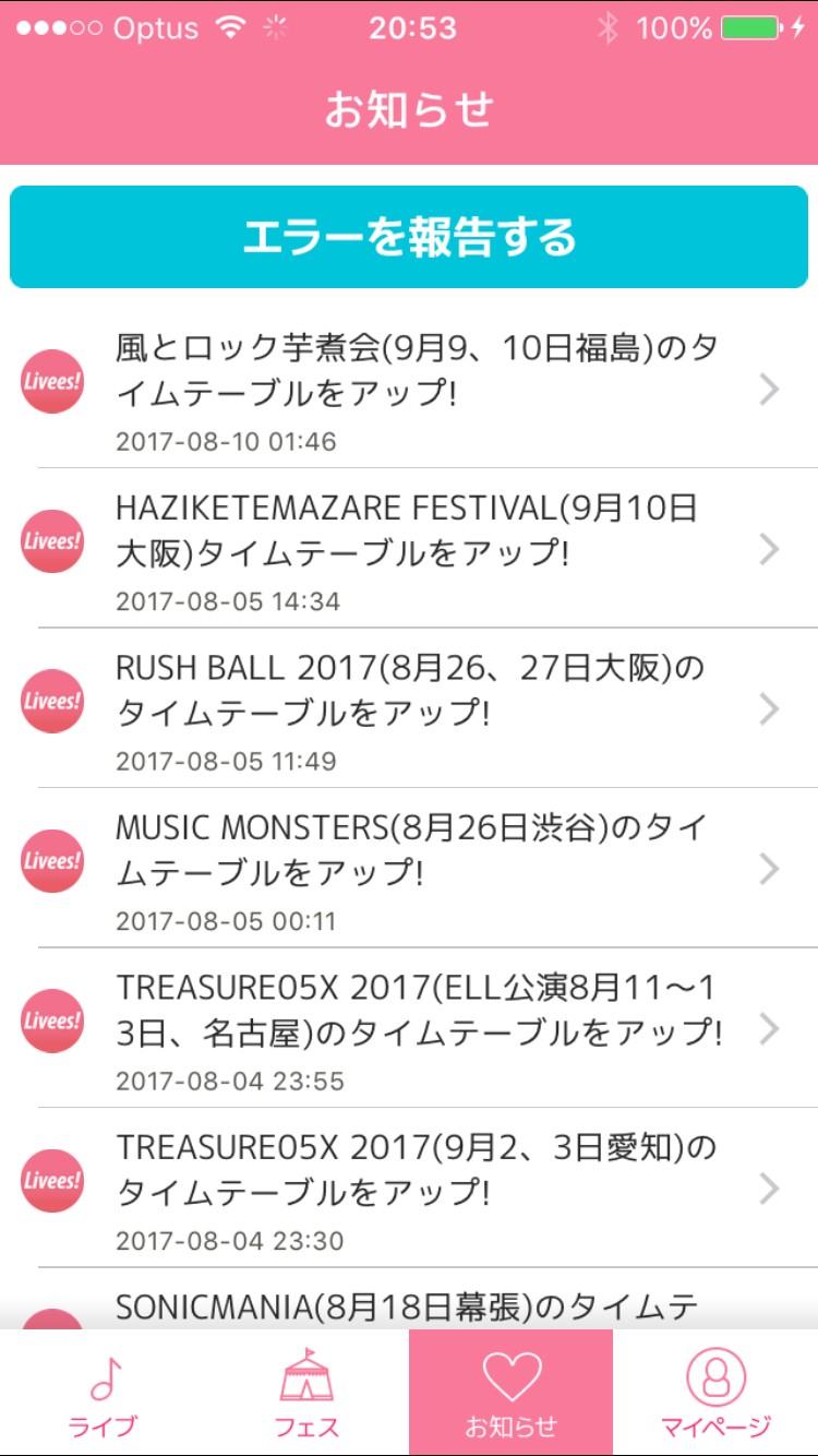 「Livees!ライブを知る、ライブでつながるライビーズ!」は、全国の主要フェスのタイムテーブルのお知らせがアップされます。これは「フェス」ボタンの隣にある「お知らせ」ボタンで見ることができます。行きたいと思うイベントのタイムテーブルをいち早くチェックして予定をたてることができますね。