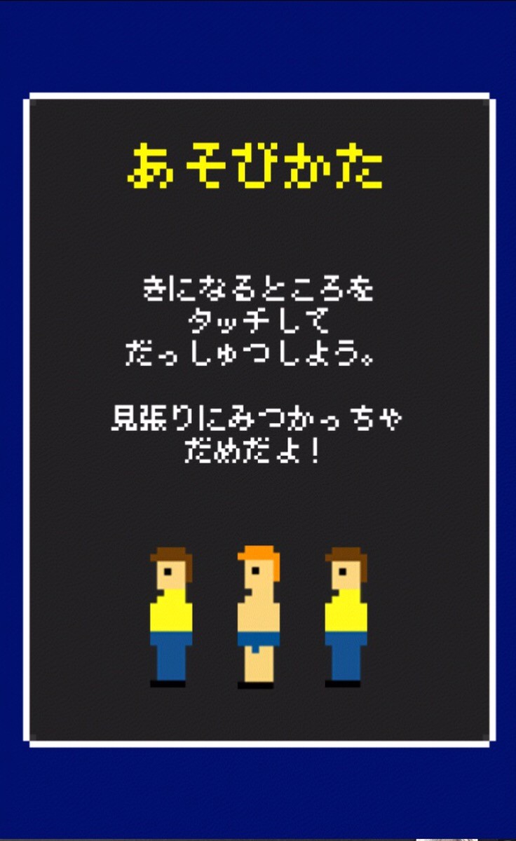 見張りの人に見つからないように、逃げるドキドキ感と、扉を開けて脱出できた時の達成感を味わうことの出来るアプリです。