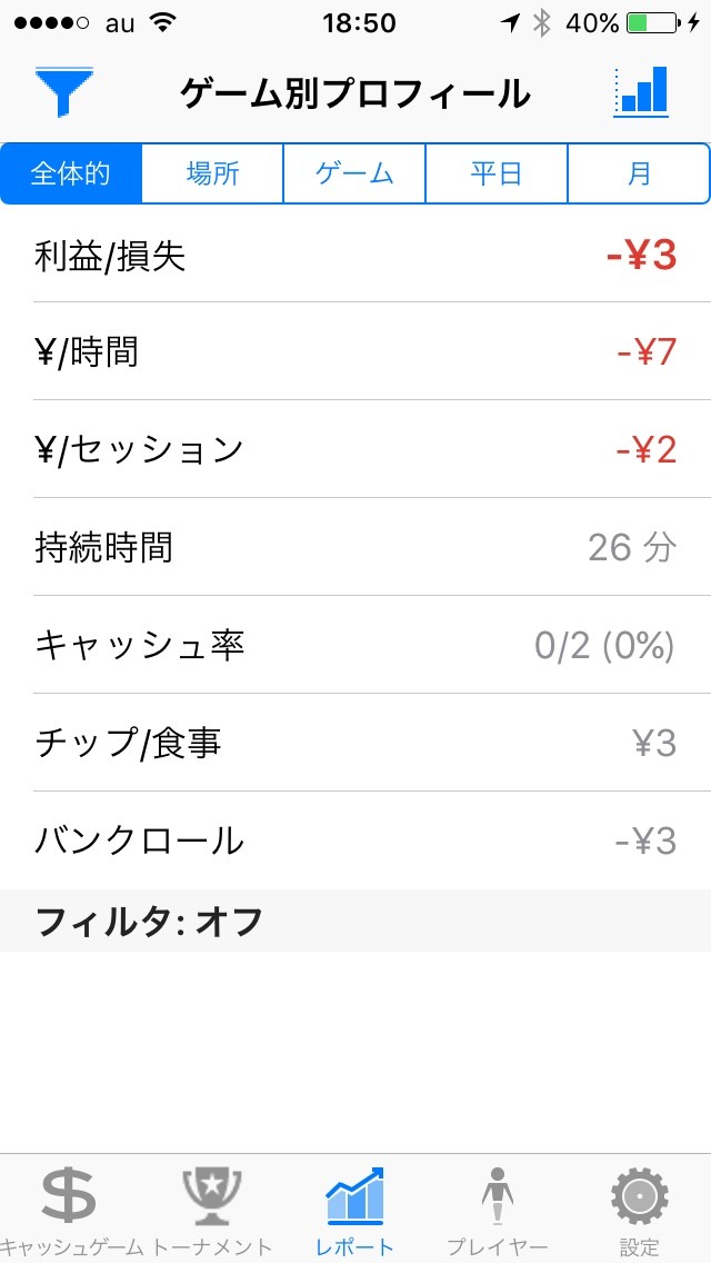 これによって、今の自分の戦略、または自分のスキルでどれくらいの時給が発生するのか、または曜日やゲームの種類によって不得手があるかどうか判断することが可能に。