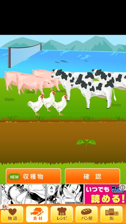 パンに必要な食材を収穫するには画面下部にある「食材」をタップし、農園に行きます。そうすると豚や牛、鳥やキャベツ、魚の網などがあり食材となる動物がたちがここにはたくさんいます。食材を収穫するには、収穫したい食材をタップします。牛や鳥などはタップをするとパンに必要な牛乳だったりチーズだったり卵などに変換します。キャベツからは小麦や玉ねぎなどを収穫することができます。ここで注意したいのが、牛や豚などの動物は大きく育たないとタップしても収穫することができません。キャベツは芽のままだと収穫できません。食材が収穫できるまでほんの30秒程度待てば食材が復活してきます。焦らず待てば食材がどんどん復活してくるので収穫タイミングが訪れたら収穫しましょう。