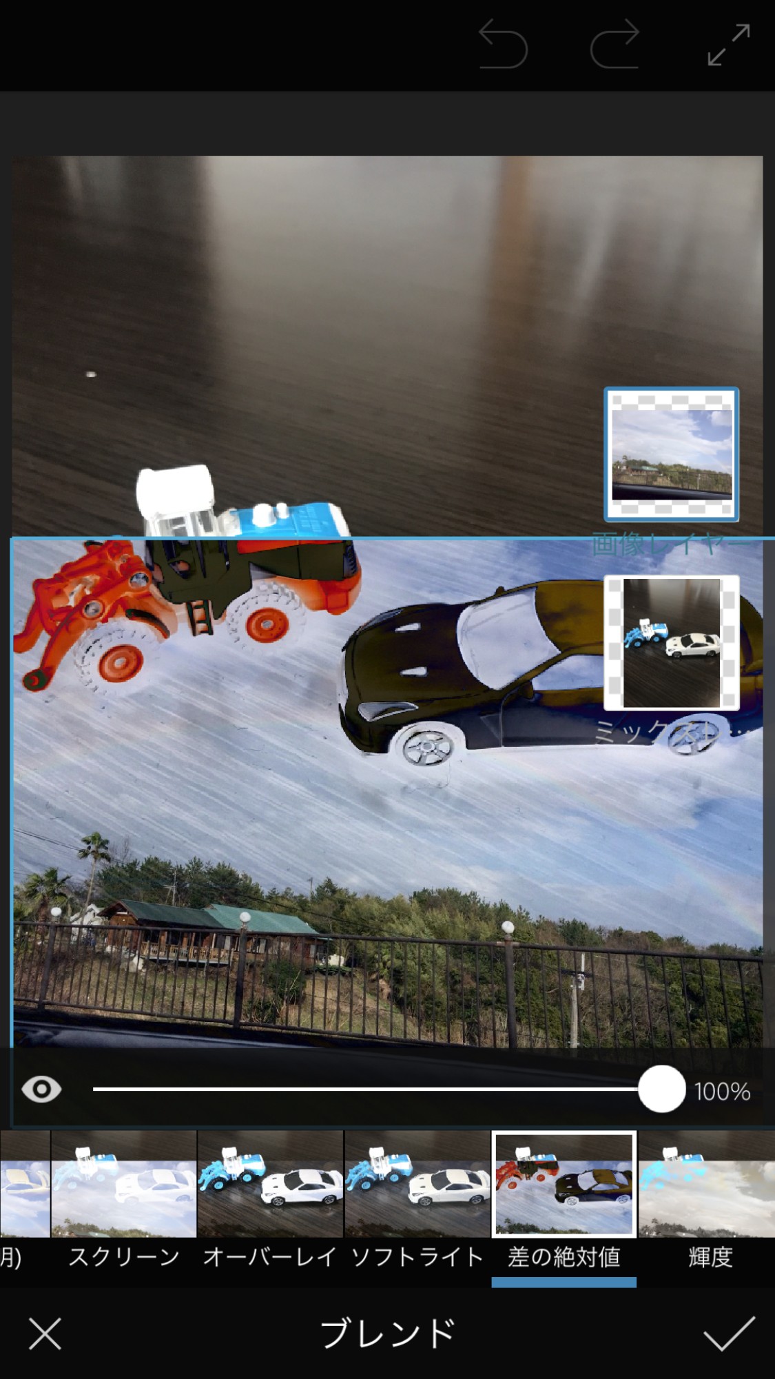 写真を選択したら「ブレンド」ボタンをタップして写真を合成していきます。ブレンド(合成)効果の種類は、通常、比較(暗・明)、乗算、スクリーン、オーバーレイ、ソフトライト、差の絶対値、輝度、カラーからブレンド効果を選んで合成します。