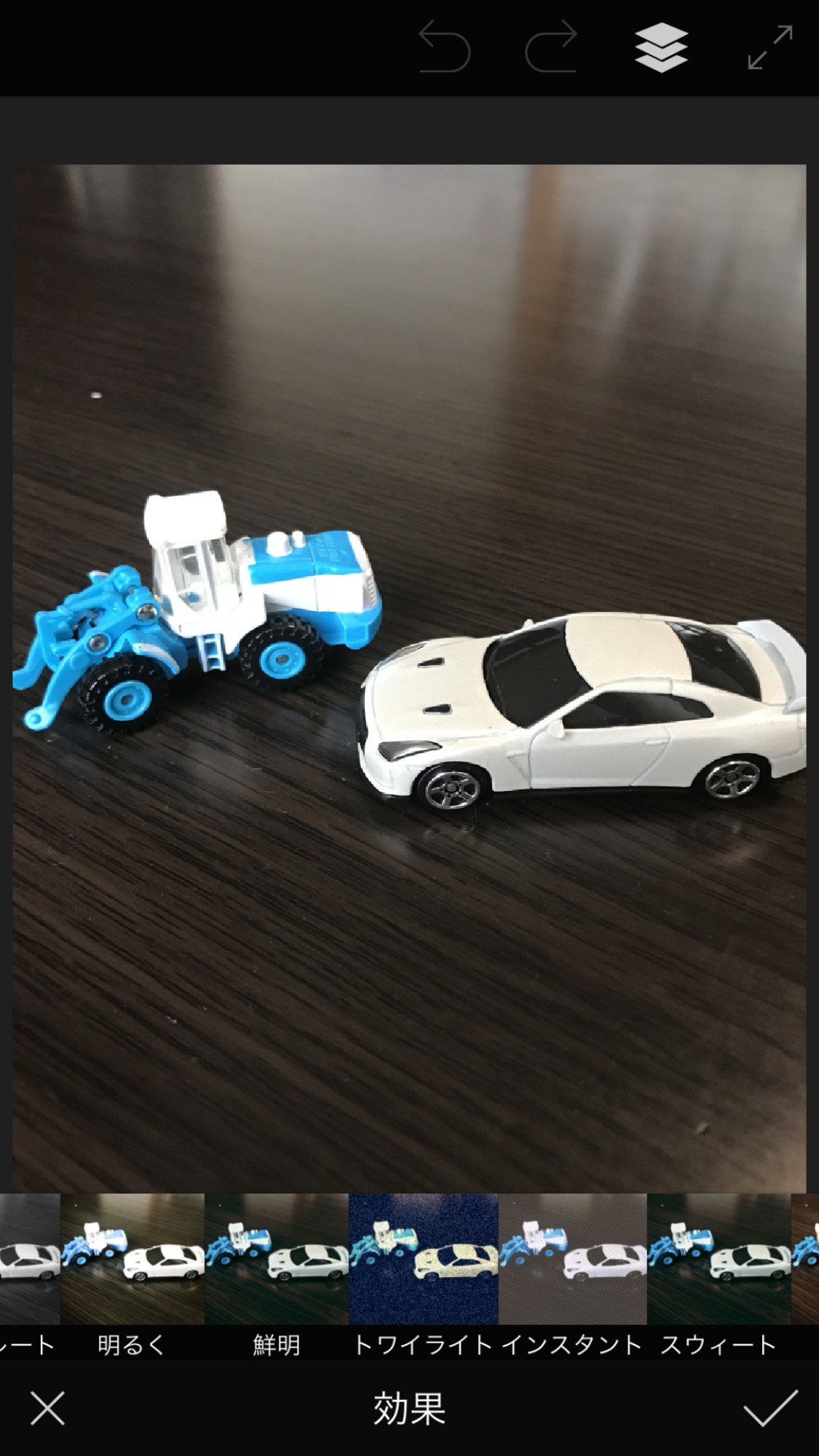 フィルターを使った加工が出来ます。ナチュラル、ポートレート、明るく、鮮明、トライライト、インスタント、スウィート、暖色、ビンテージ、セピアなど20種類以上のフィルターが揃っています。ビンテージやセピアなどを使うとモダンな雰囲気の写真が出来上がるし、明るくや夏などのフィルターを使うと色鮮やかな明るい雰囲気の写真になります。作りたい写真の雰囲気を思い描きながら選択してみるといいですね。