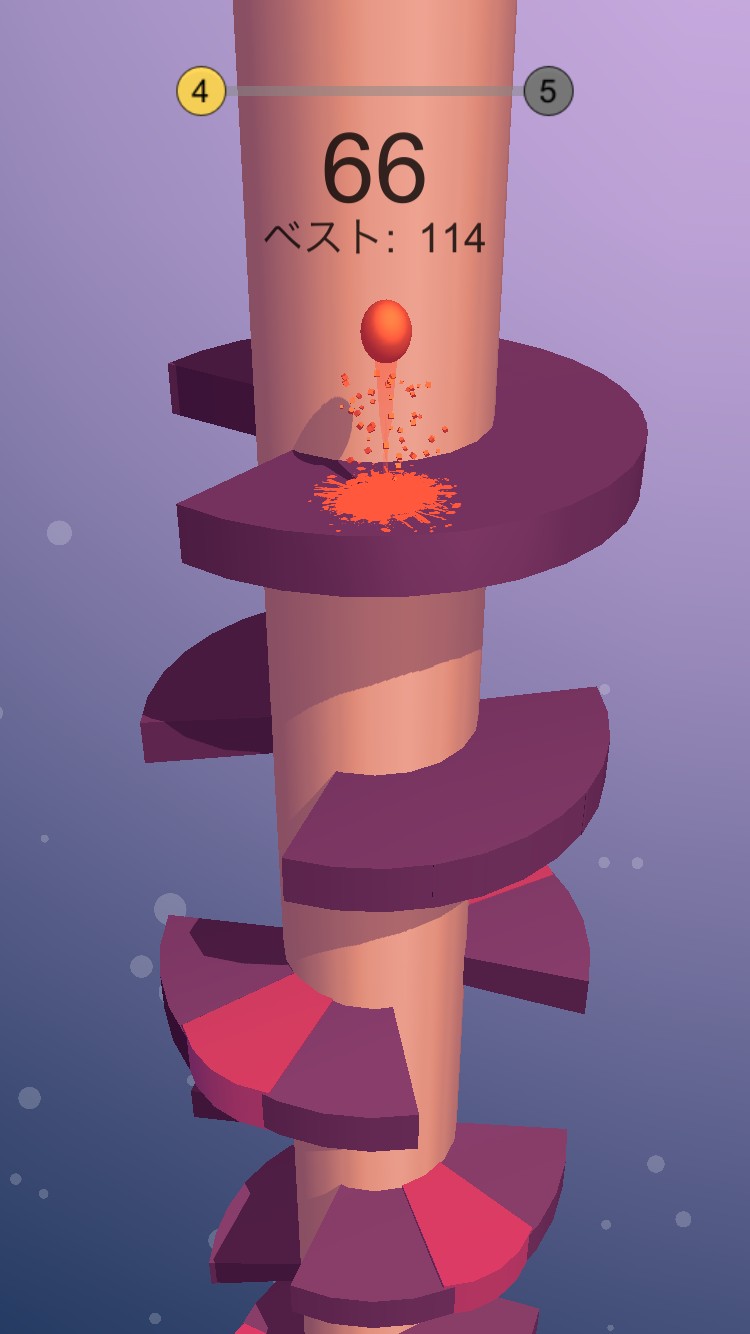Helix Jumpは、弾むボールをらせん状のタワーの上部から隙間を通しながら最下層まで届けるゲーム。画面をフリックすることでタワーが回転し、隙間からボールを下に下にと落としていきます。最下層まで到着できればクリアで新しいステージが用意されます。しかし、色の変わっている部分にボールが当たってしまうとアウト。最上部からのやり直しとなってしまいます。