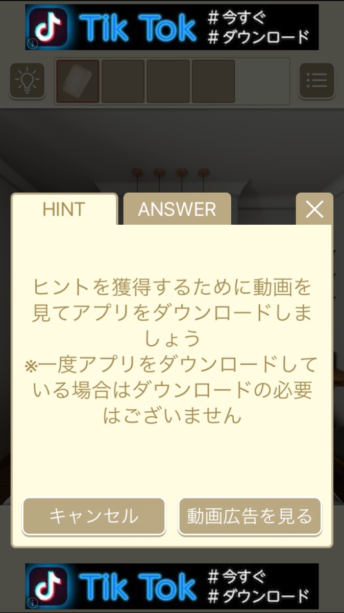 謎が解けなかったり早く次に進みたくなったりしたら、ヒントや答えをみましょう。ヒントや答えを確認する場合は、まず画面左上の電気のマークをタップします。ヒントや答えは動画を見ると確認することができるようになります。動画広告は数秒で終わりますが、時間がないときは後でチェックしましょう。