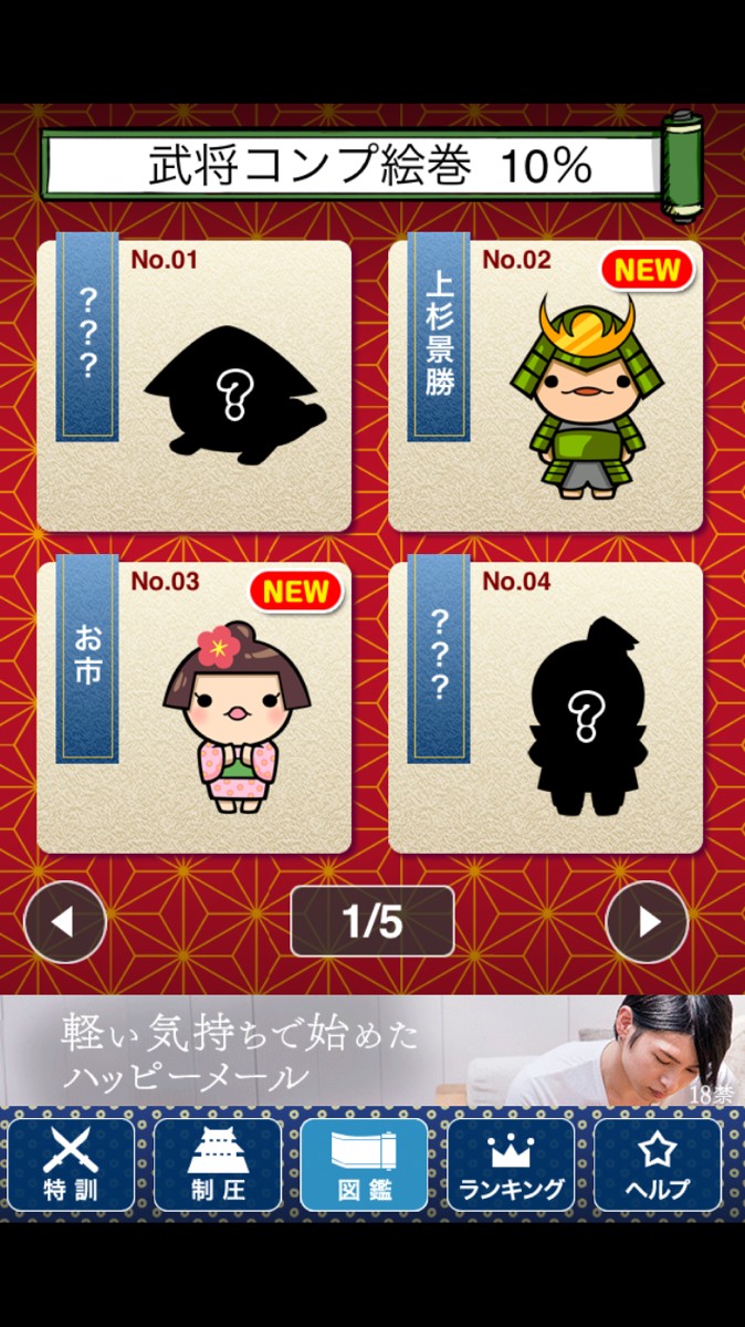 よくある「戦国武将」アプリといえば、渋いおじ様が兵士を引き連れて戦う!というのがお決まりのパターンですが、こちらはかわいい戦国武将に兵士です!「武将コンプ絵巻」にたくさんの種類の武将たちをコレクションできるのもいいですね。GETしてない武将たちは影になっているので、シルエットから「どんな武将なんだろう」と想像しながらプレイするのも楽しいですよ。とにかく簡単操作で、初心者がプレイしやすいゲームアプリです。