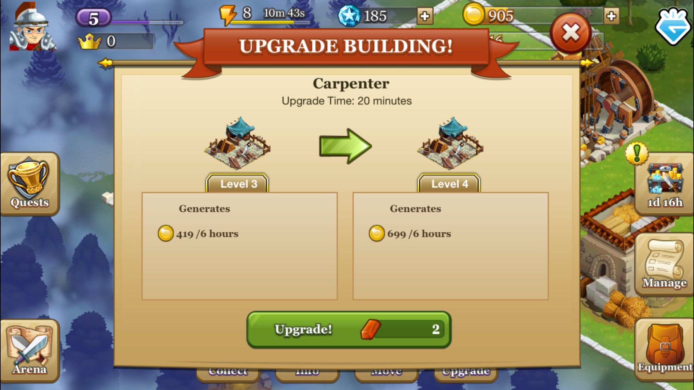 それぞれの建物をタップし「Upgrade」を選択することでレベルアップすることができます。