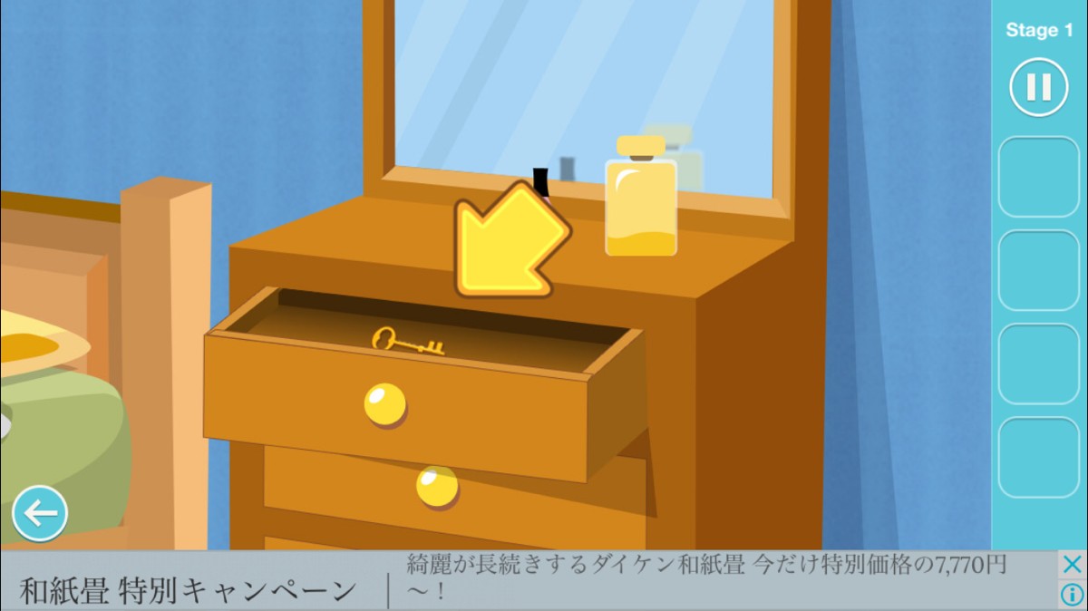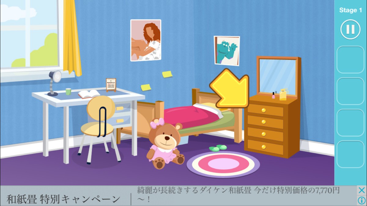 2.ステージ1はチュートリアルなので、捜索個所が矢印で表示されます。矢印に従ってタップしてみましょう。タップした箇所は拡大表示されます。さらに矢印が詳細な位置を示すので、タップしてください。中からアイテムが出てきましたが、ゲーム機ではないのでまだクリアではありません。ゲットしたアイテムは画面右に収納されます。