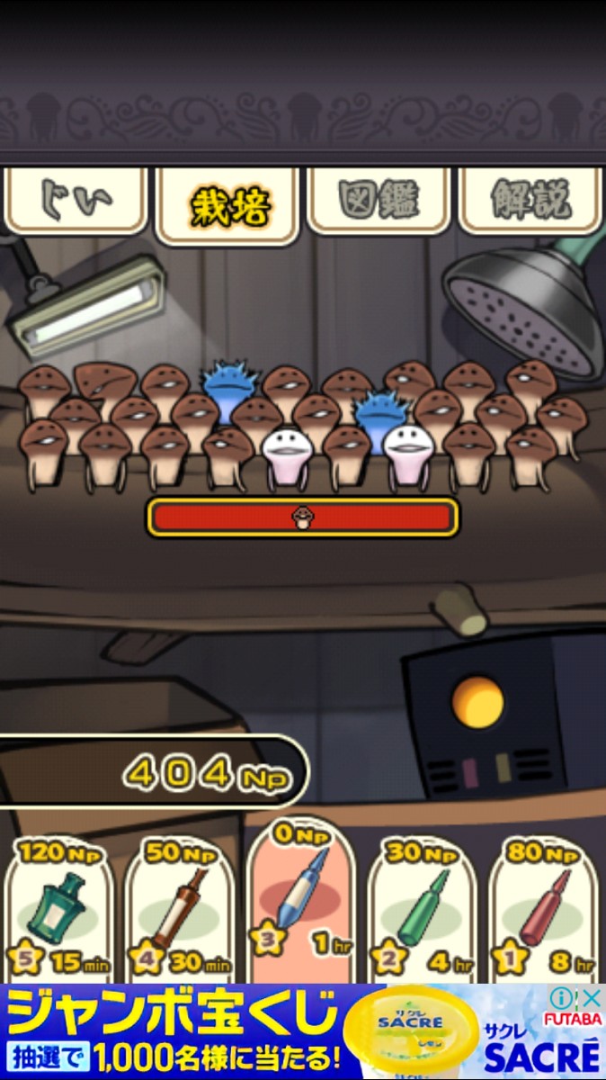 なめこを収穫すると、NP(ポイント)がもらえます。貯めたNPで設備投資し、設備のグレードが上がっていくと、生えてくるなめこの種類が増加!