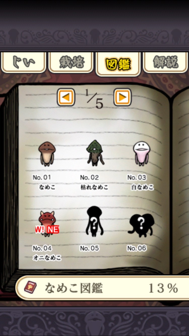 新しいなめこは図鑑に登録されます。図鑑には、クスッと笑えるなめこの生態が記載されていて、ついつい時間を忘れて眺めてしまいます。
