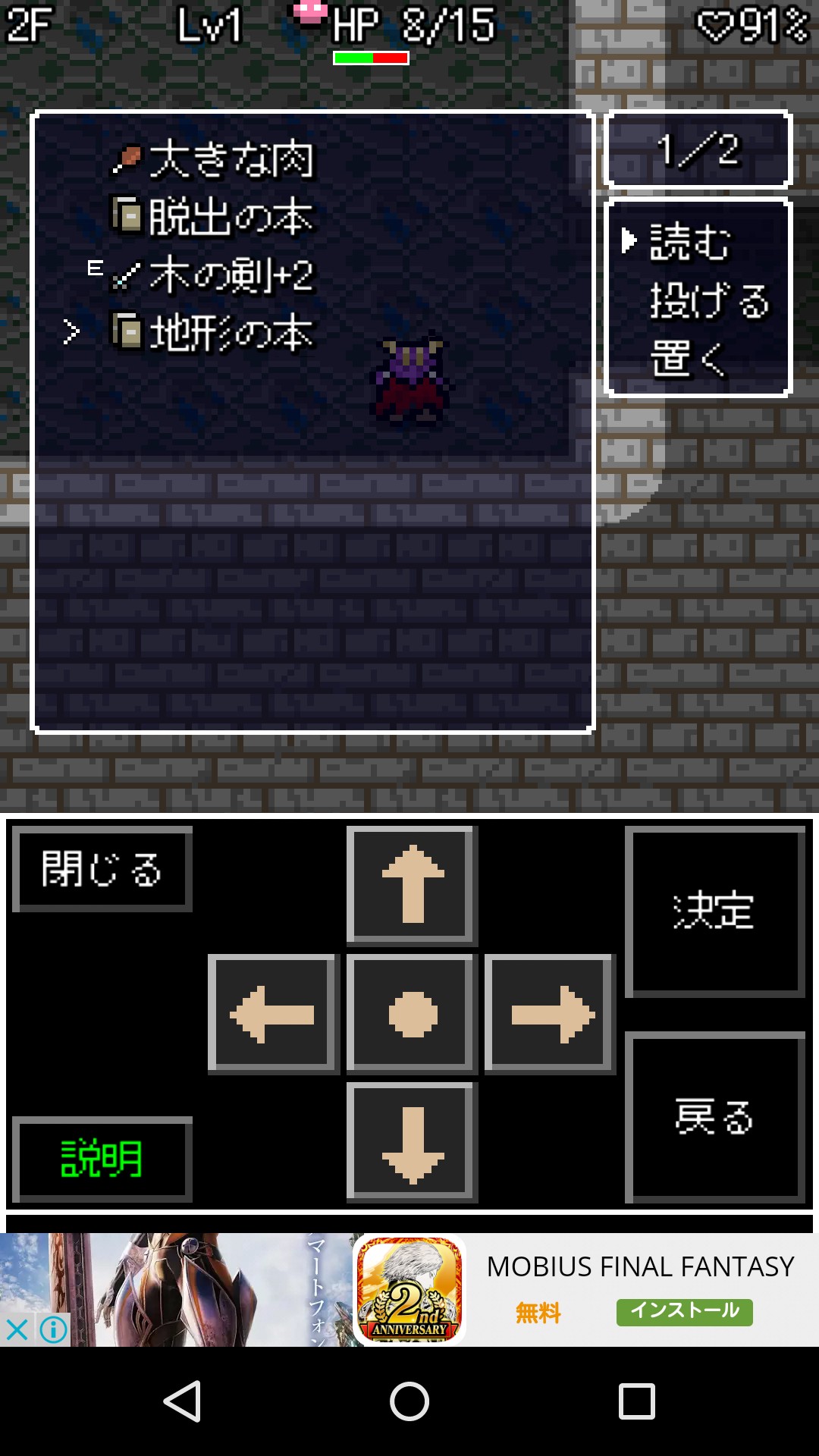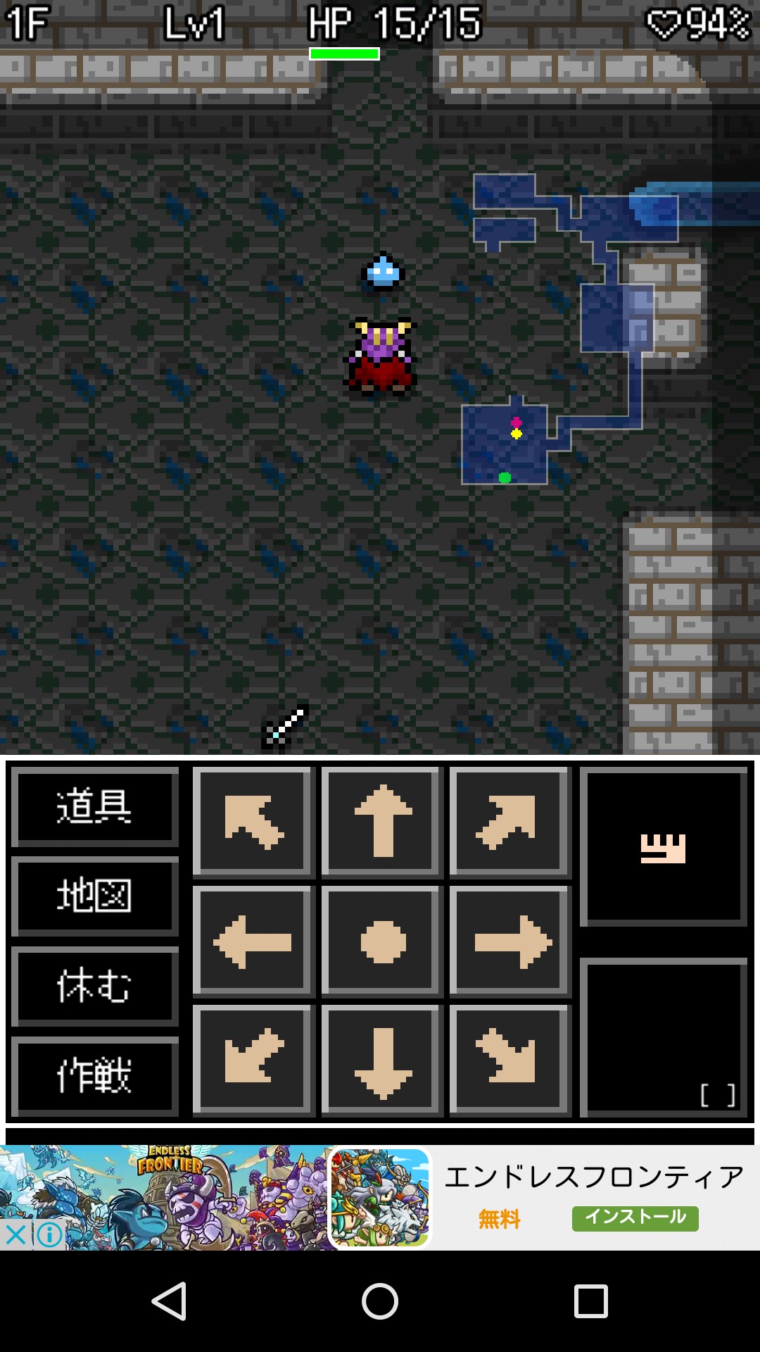 まずは名前もそのままの「最初のダンジョン」へ侵入して操作を覚えてください。移動は画面下の八方向矢印で行います。中央の点を押して各方向へスライドさせると、