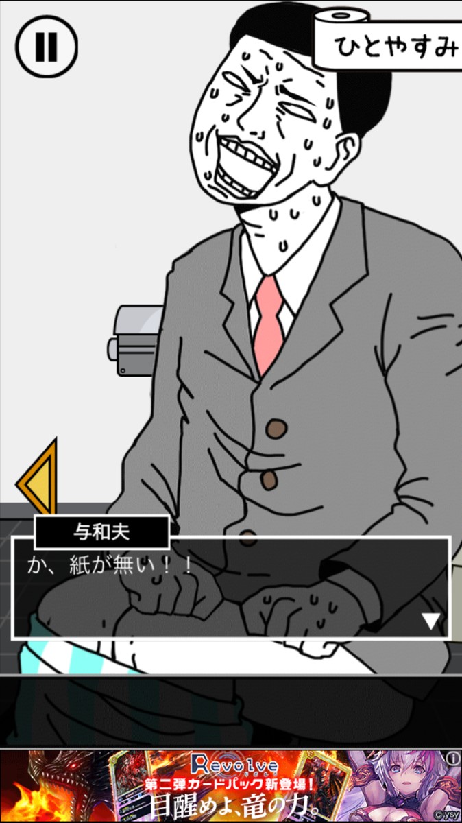 1.「トイレに入ったら紙がない」を実際にプレイしてみました。与和夫が個室内でトイレットペーパーがない状況からゲームはスタートします。