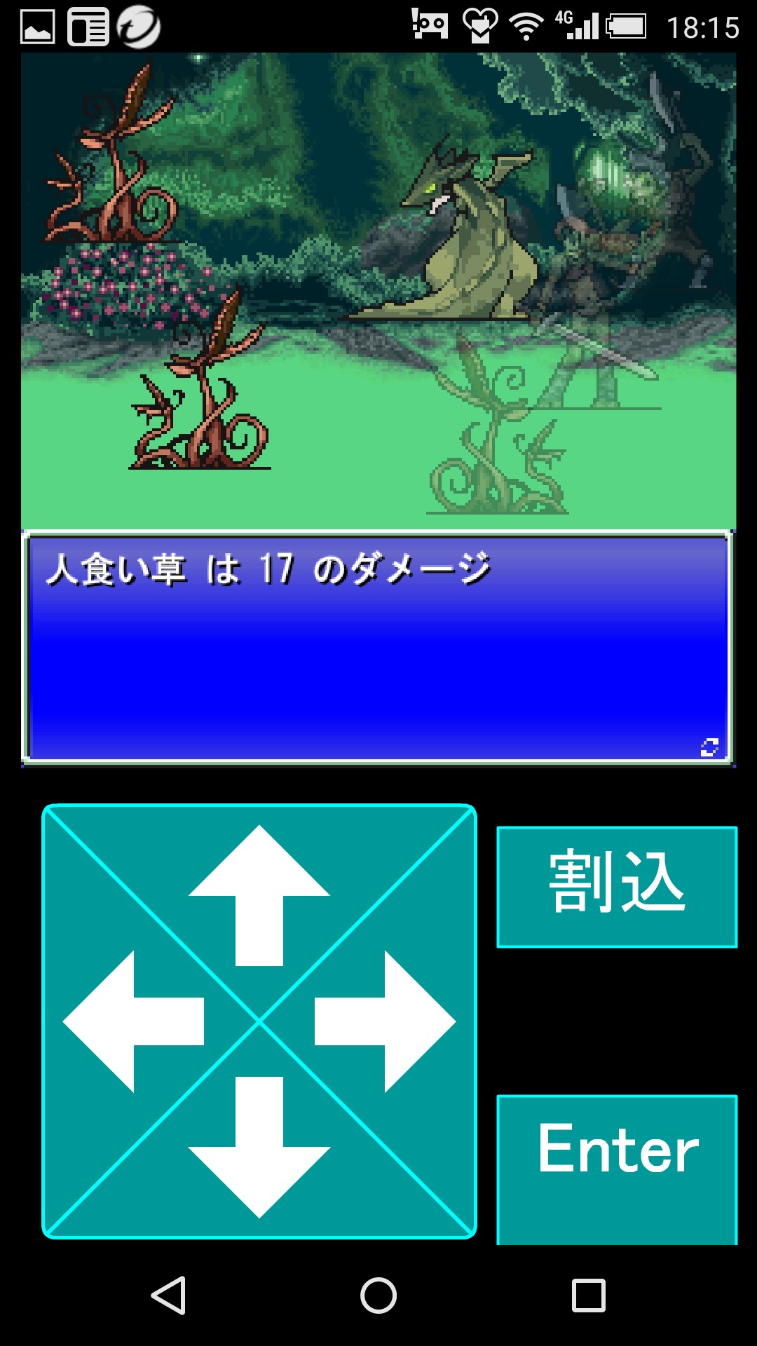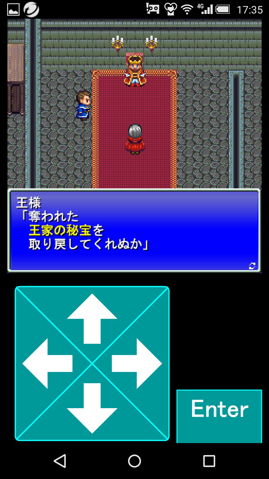 王様に頼まれて王家の秘宝を探索することになります。画面下が操作を行う部分で矢印キーをタップで指定の方向へ移動です。矢印キーの右側でメニュー・地図・Enter(決定)を行います。