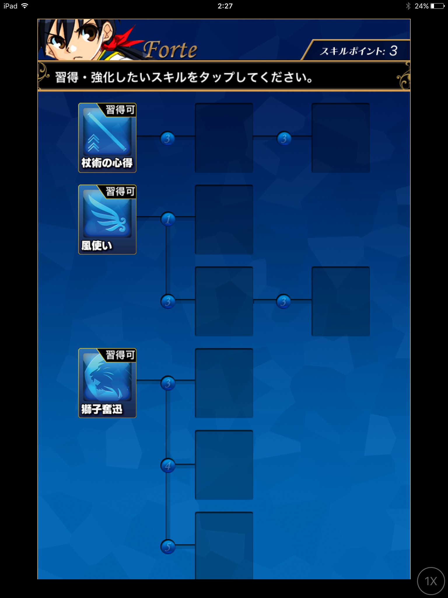 例えばフォルテだと最初は棒術の心得・風使い・獅子奮迅の3つに割り振ることができて、一定以上ポイントをふると先のスキルツリーが解放される仕組みです。