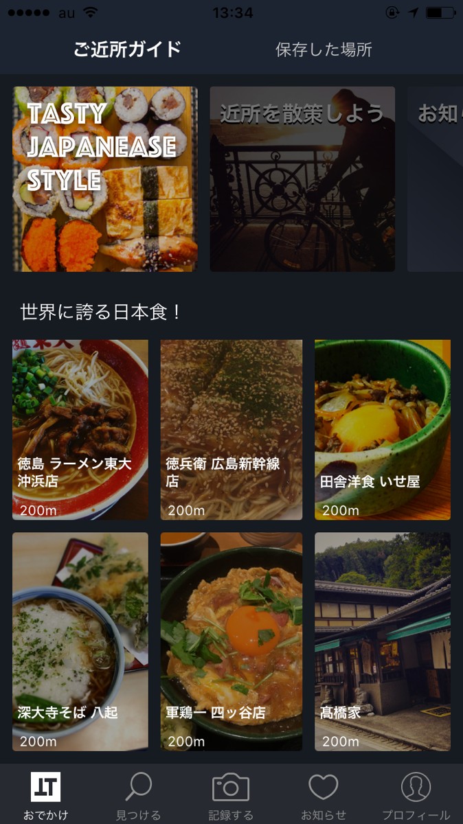 ・位置情報を許可すれば、近所のおすすめスポットを紹介してくれます。近場の温泉が知りたい場合や、動物とふれあいたい…など、目的別に見ることができます。