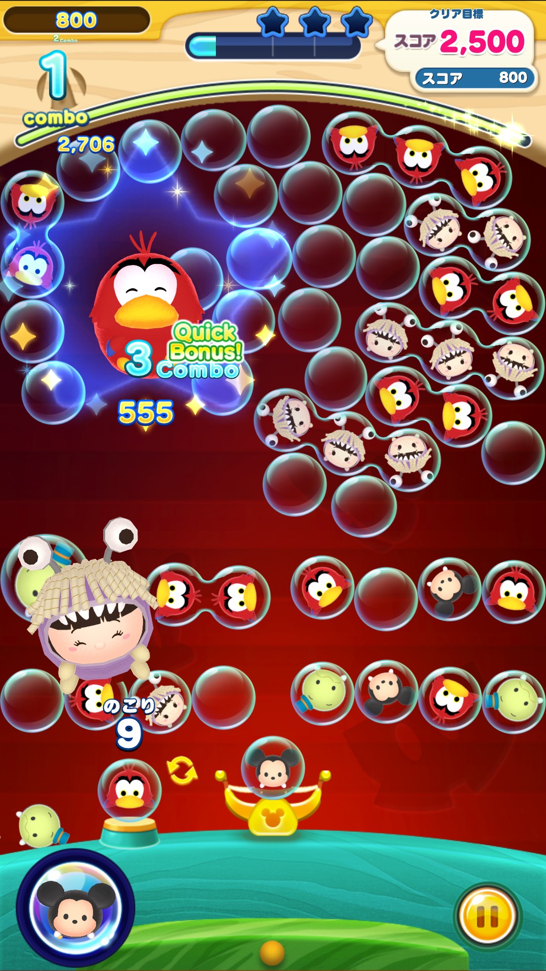 有名なツムツムが今度はバブルシューティングになって登場!かわいらしいツムはそのままに新たなパズルを楽しめます。今回はステージ制で、一定数のバブルを消す、得点を稼ぐなどの条件を達成してクリアします。消すためには角度を考えながらツムを引っ張って飛ばし、同じツムを4つ以上くっつけてください。透明なバブルや違うツムは通り抜けるので頭を使いましょう。他のバブルシューティングと違うところはバブルを飛ばして終わりではない点です。