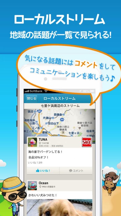 「Eyeland(アイランド)」ではたくさんの情報が飛び交っていて、ローカルストリームでは多くの人がつぶやいています。ローカルストリームはタイムラインのようなもので、画像の投稿もでき、文字だけでは伝わりにくいこともわかりやすく共有できる点が魅力的です。近所で見つけた面白いものや地域のお祭り、イベントの告知などが投稿されていて色んな情報が共有できます。マップを動かすとその先々のローカルストリームが見れ、見ているだけでも楽しめるアプリです。
