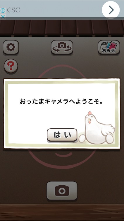 「おったまキャメラ」の使い方ですが、まずアプリをダウンロードして起動すると、自分のスマホのカメラロールへのアクセスの許可を求められます。自分のスマホのデータフォルダに写真を保存したい方はここで「許可」にすることを勧めします。そうすると、アプリを起動すればカメラ画面になるので撮影していきましょう。画面上の説明ですが、左上には各種設定を行う設定ボタンがあり、中央には外向き内向きなどのカメラを切り替えることができるボタンがあります。そして、画面中央には「おったまキャメラ」のキャラクターでもあるおじさん顔のたまごが表示されています。このおっさんたまごの表示に合わせてあとは、画面下部にあるカメラの絵柄の「撮影ボタン」をタップすれば撮影することができます。