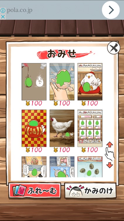 「おったまキャメラ」ではいろんなフレームに変えることができます。画面右上の「おみせ」のボタンをタップするとショップに行くことができます。ここでは一つ100円で違った面白い鳥やたまごのフレームが豊富です。例えば、鳥がたまごを産んだ瞬間のフレームだったり、他のおっさんたまごたちと一緒に鍋の中で茹でられているフレームだったり面白いフレームがあります。商品を買うと便利な「カラむき爆弾」もおまけで付いてきますよ。「おったまキャメラ」で作った写真はもちろんスマホの写真フォルダに保存することができます。また、「おったまキャメラ」はフレームだけでなく、おっさんの髪型を購入して変えることができます。大仏さまのような髪型や、校長先生の頭のような髪型、黒い眼帯をつけている海賊のような、黒ひげのようなものまで様々です。面白い髪型を見つけて自分だけの写真を撮ってるのもおすすめです。