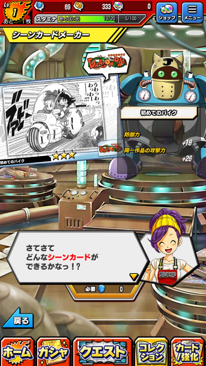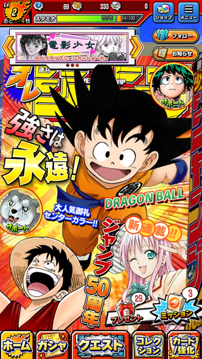 セットできるキャラクターカードは5枚。シーンカードをキャラクターに装備させれば、そのキャラクターが強化されます。デッキ編成したキャラはアプリホーム画面の自分だけのジャンプ表紙になりますよ!嬉しい演出ですよね。