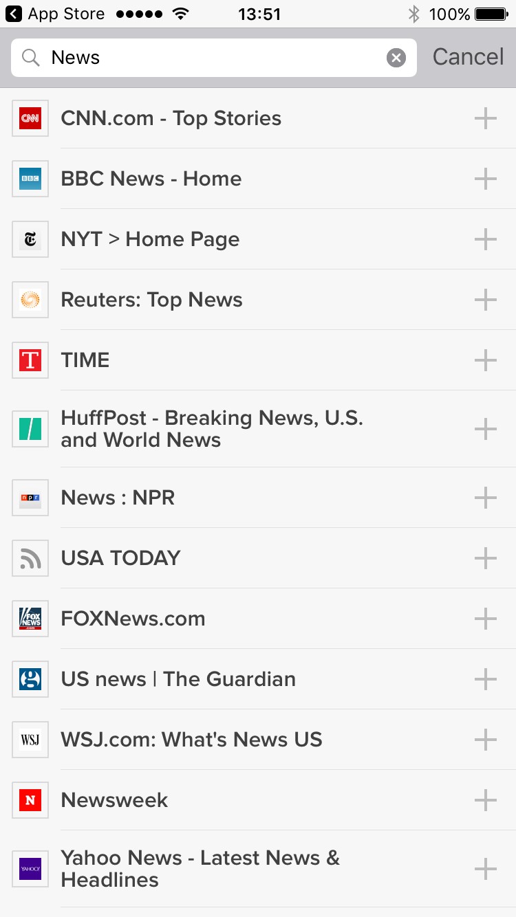 勿論、英語のWEBページを登録して「Newsify」を使いたい人は、このカテゴリをタップするとNewsでしたら、すぐにCNN、BBC・・とサイトの候補が出てくるので、