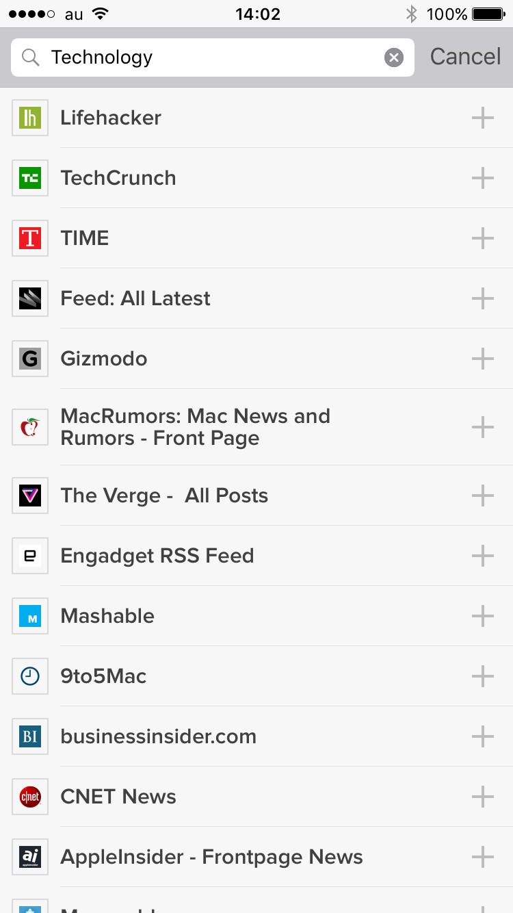 ①「Newsify」ホーム画面上にある「+プラスボタン」をタップします。WEBページのカテゴリが(News、Technology、Gadgets、Sports、Business、Fashion、Gaming、