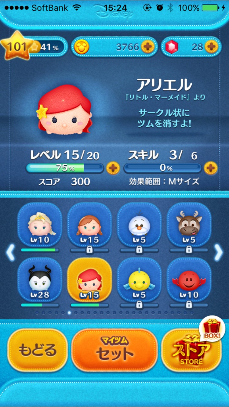1ゲームごとに、マイツムと呼ばれるツムを1つ選択します。ゲーム中、マイツムを一定数消去すると、スキルを使用することができます。スキルは、ツムごとに違います。ミッキーなら、画面中央のツムをまとめて消すことができます。リトルマーメードのアリエルは、サークル状にツムを消します。それぞれスキルが違うので、演出も見ていて面白いです。