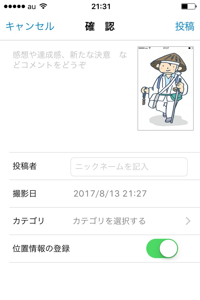 「お遍路さん 足あとフォト&マップ」に投稿した写真には、簡単なコメントを残すことが可能です。そのときの天候や気温、達成感やその後の目標などを記せば、気持ちを新たにしてお遍路巡りを続けることができるでしょう。