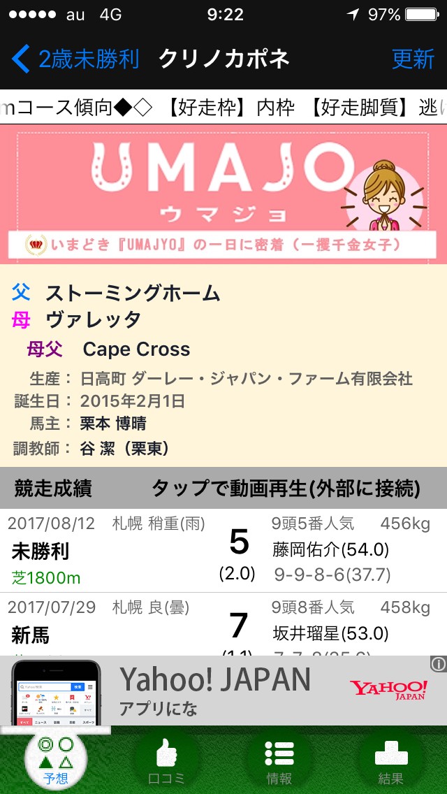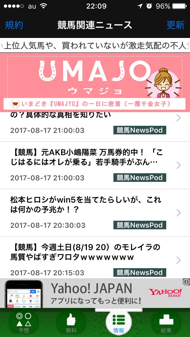 画面下部の「情報」をタップします。競馬関連ニュース一覧が表示されますよ。画面をスクロールして、気になるタイトルがあったらタップしてみましょう。ニュース詳細が表示されます。