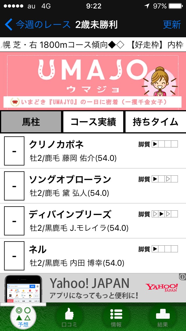 アプリ起動後、画面下部の「予想」をタップします。今週のレースの予想情報が日にちと場所ごとに表示されますよ。気になる場所とレース名をタップすると馬柱、コース実績、持ちタイムをチェック可能です。馬柱から名前をタップすると、さらにその馬の詳細をチェックできますよ。予想は当日の9時40分に全レース一斉に行われます。