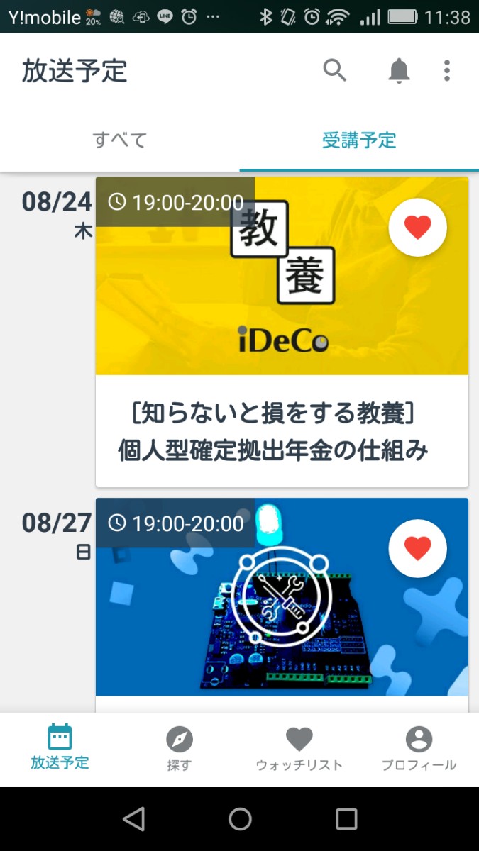 ハートマークを付けた授業は、受講予定の一覧にあがってきます。日付ごとのタイムテーブルで、授業を確認できるので予定が組みやすくわかりやすいです。また、リマインド機能もあるので、授業開始5分前になるとお知らせしてくれます。