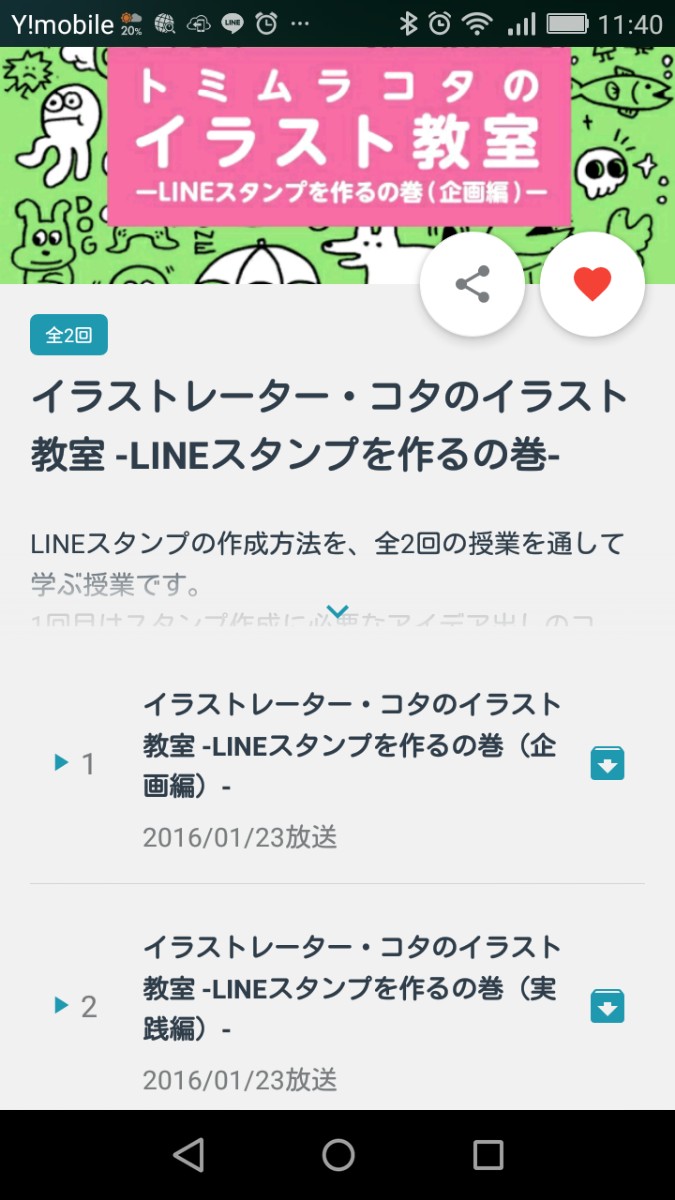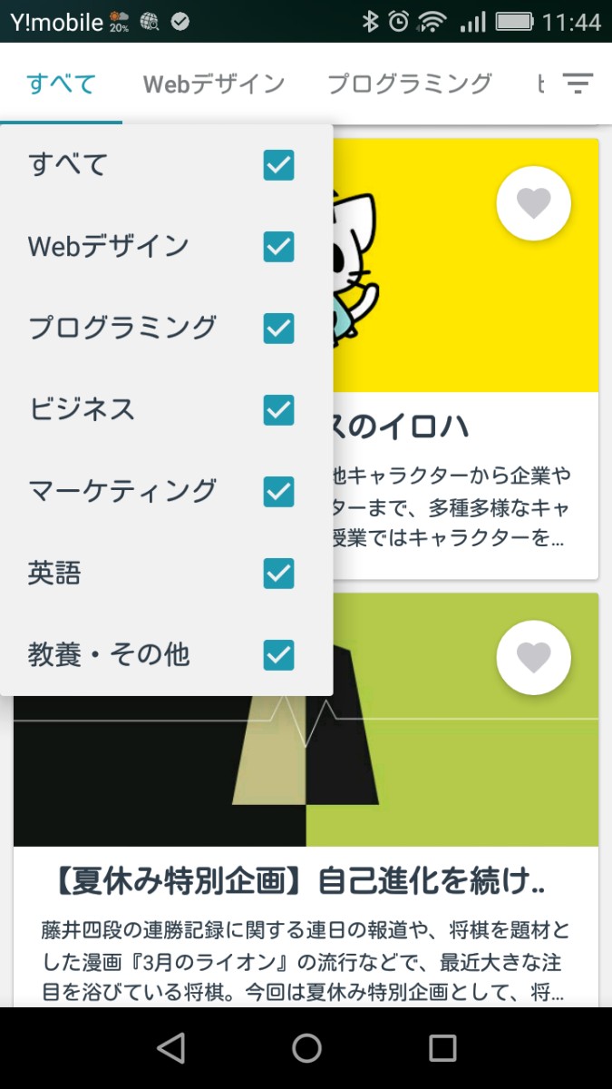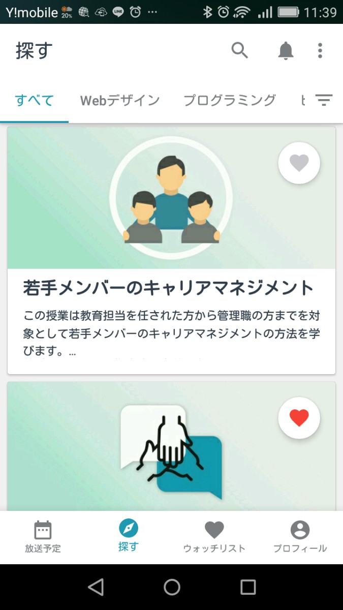 カテゴリは、Webデザイン・プログラミング・ビジネス・マーケティング・英語・教養その他に分かれていて、興味のある分野の中から受けたい授業をみつけ、ハートマークのボタンを押します。