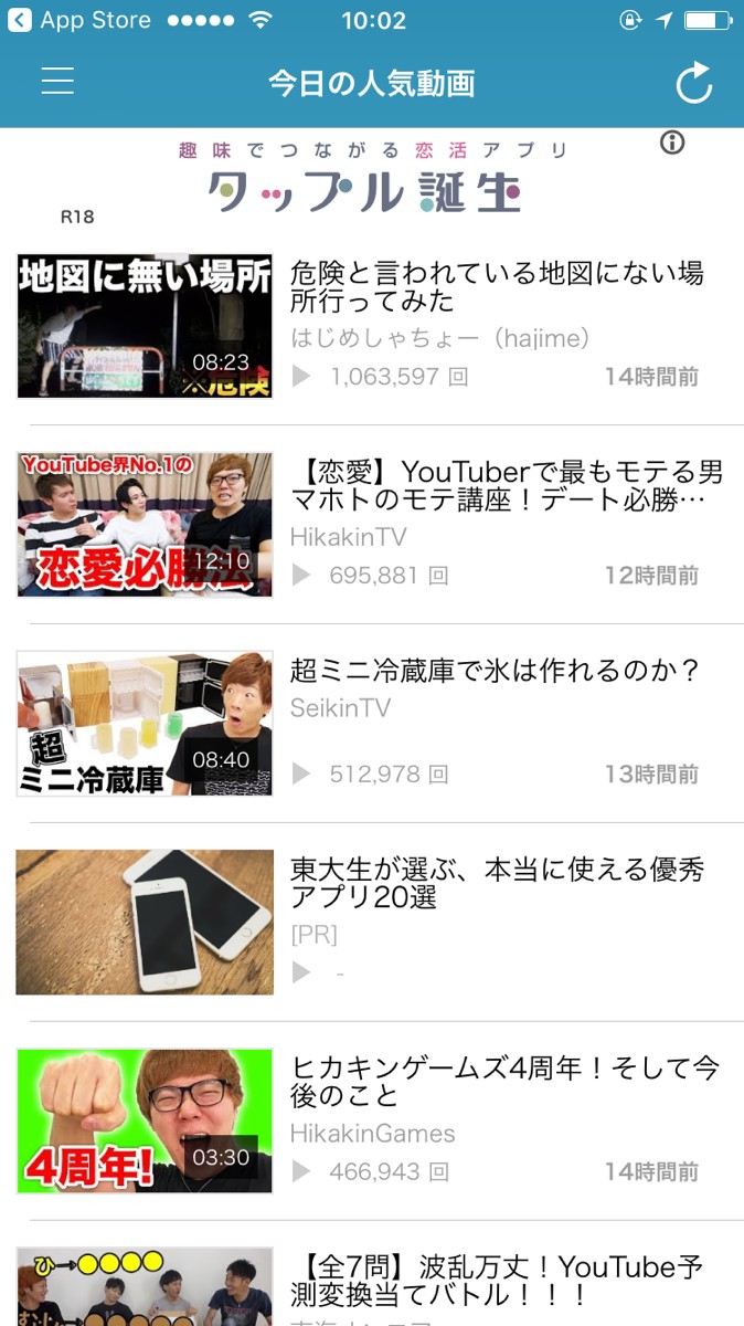 「動画まとめ for ユーチューバー」のアプリを起動して、今話題のユーチューバーの動画を早速チェックしてみましょう。