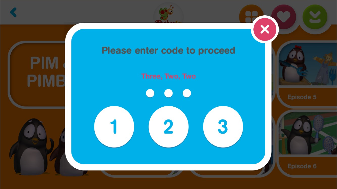 設定画面や、有料画面に移行するときには、3桁のロック画面が登場します。「one、three、two」のように表示されるので、指示通り数字をタップするとロック解除可能。5歳以下の子どもにはロック解除ができない難易度で安心です。