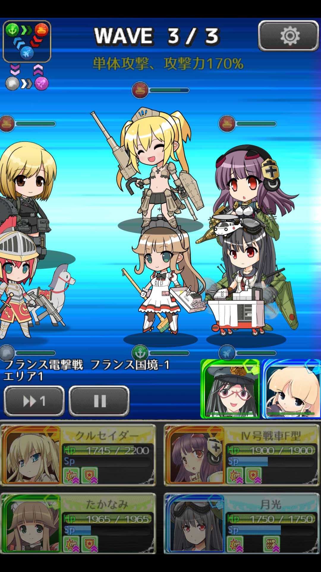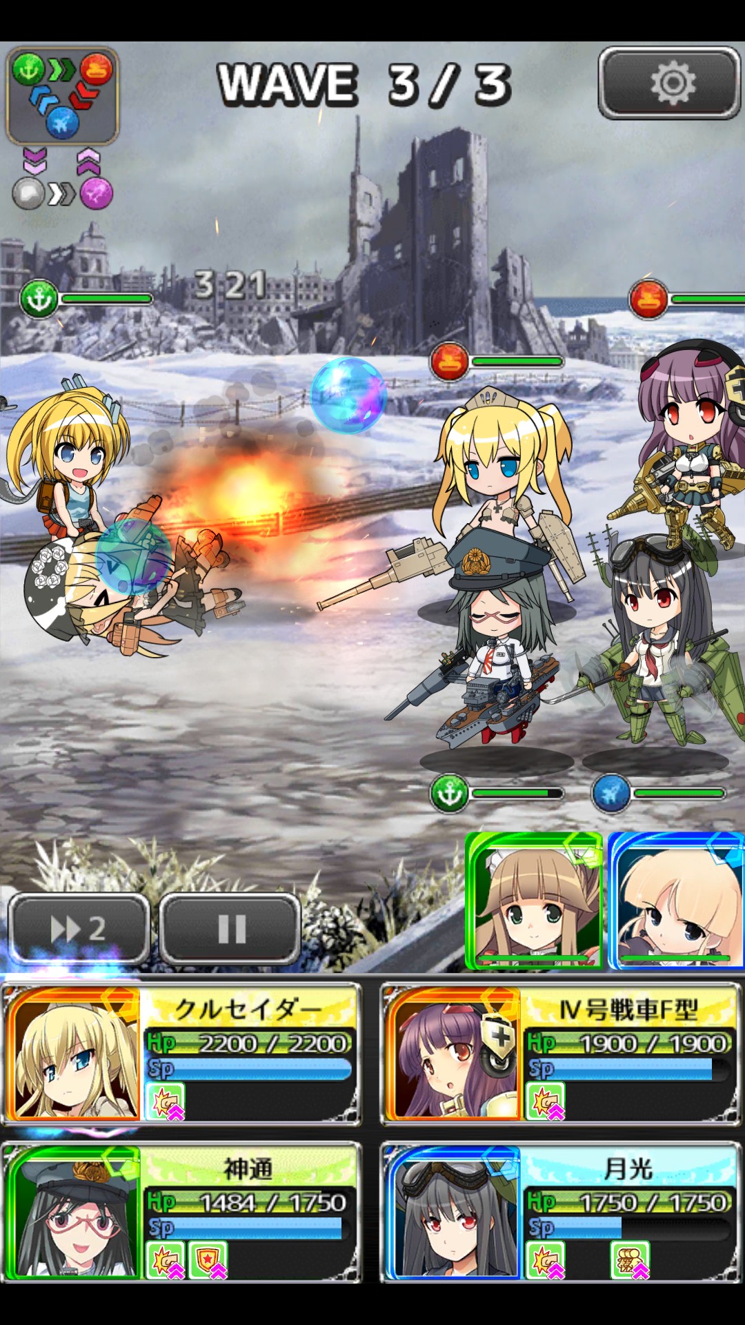 ダメージを受けてやられそうなときはキャラクターを左右にスワイプして前後列をいれかえてください。前列は攻撃力が上がる代わりに被弾しやすく、