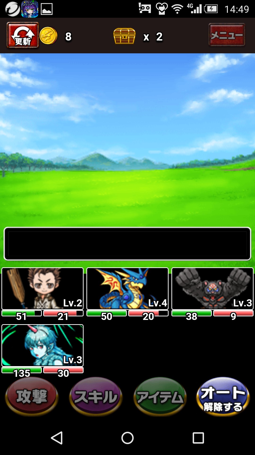 弱い敵であればオートを使うと放置で全て終わらせてくれるので便利です。プレイヤーのスキルは装備に依存し、モンスター共にSPを消費します。