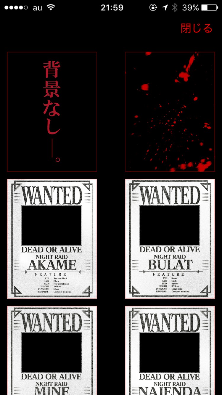 「我等全員殺し屋稼業」のフレームを選択して、「アカメが斬る!」の世界観を楽しむ事ができます。