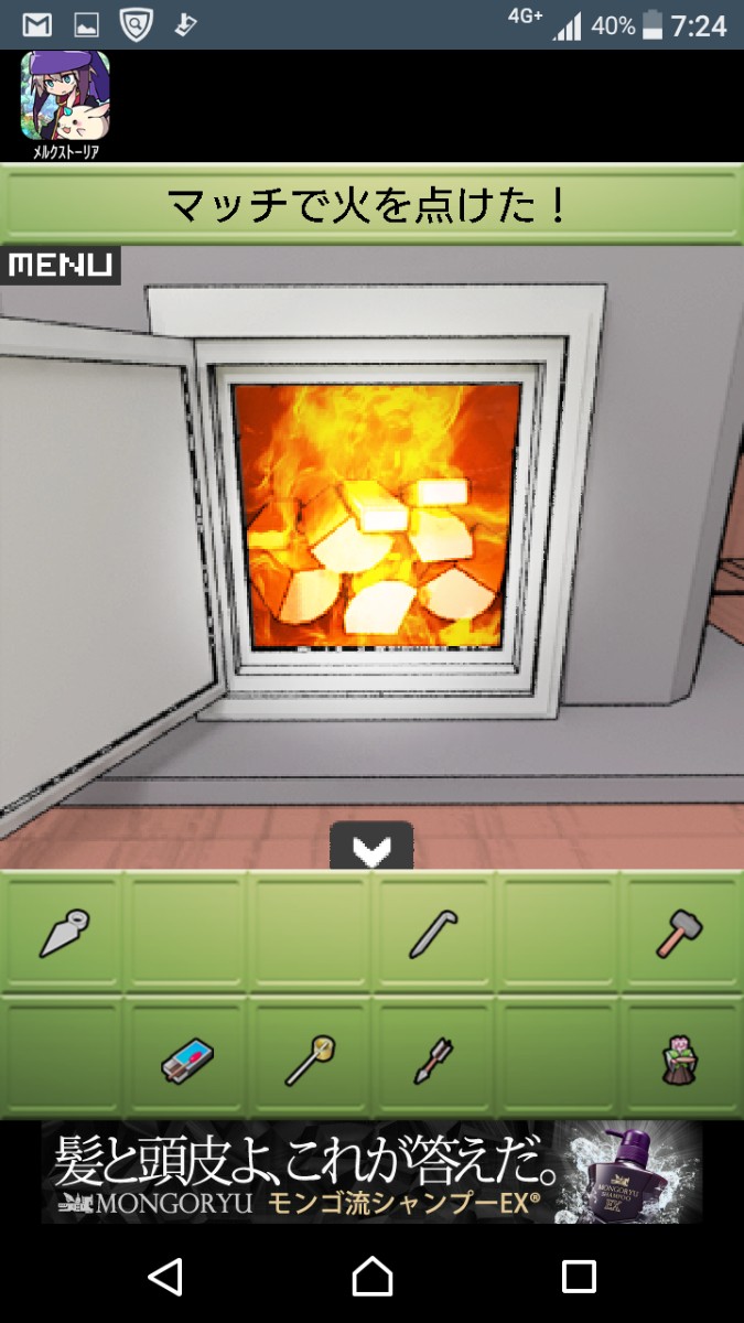 部屋の中では、スワイプしても、画面左右の矢印をタップしても見渡せます。釜戸に薪をくべたり、壺の水を柄杓で汲んだり、一瞬、何をするの?と思うような時にあなたの勘が働いて、脱出へのガキの在り処を閃くでしょう。繊細な仕掛けが散りばめられたゲームです。