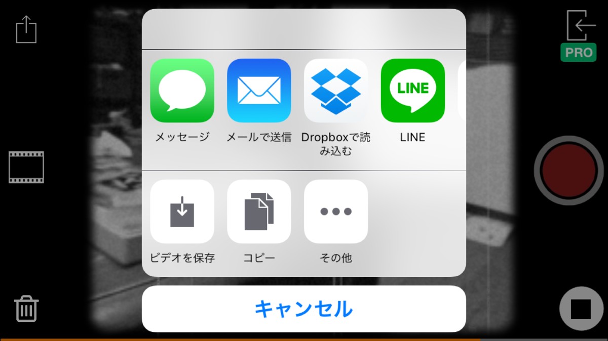 撮影が終了すると、ビデオを保存またはSNSで共有することができます。フィルムボタンの上にある四角のボタンをタップしましょう。