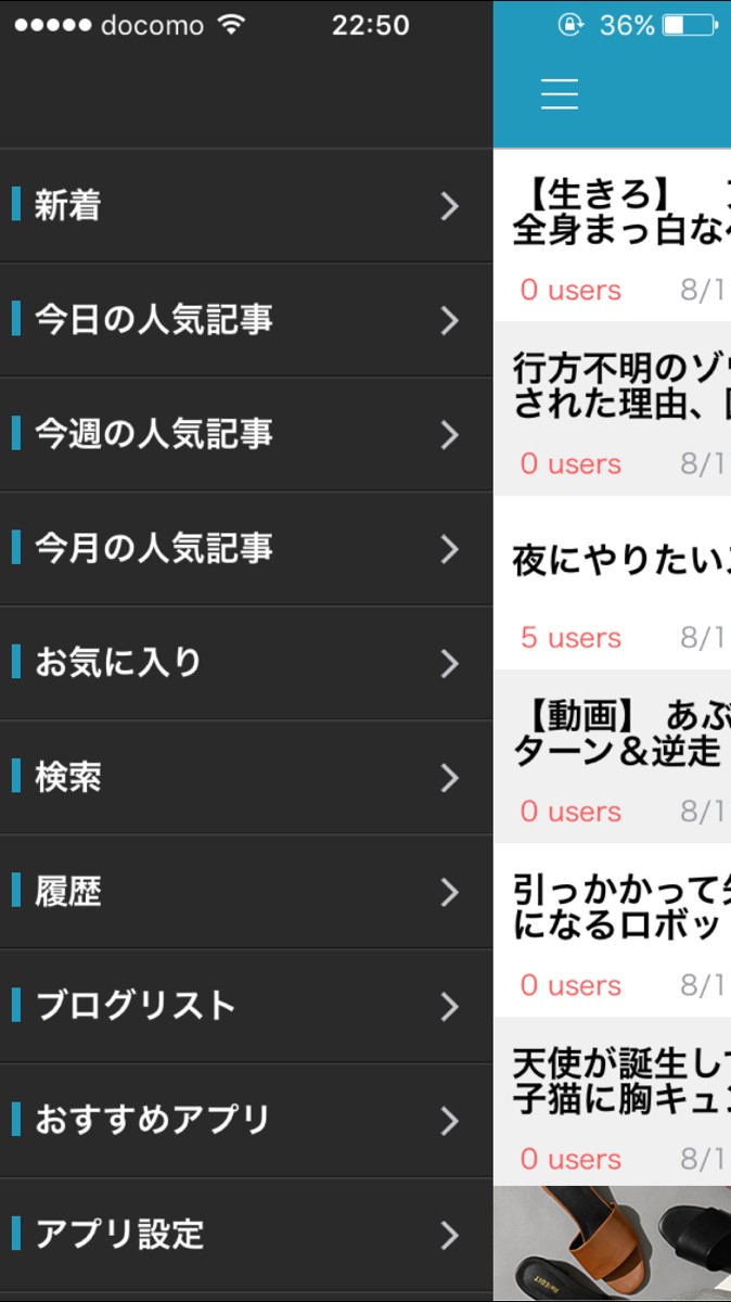 アプリ起動後、面倒な登録などは一切せず動画を探すことができます。画面左上のメニューボタンをタップすると「新着」や「今週の人気記事」などを見ることができるのでタップして一覧をみましょう!