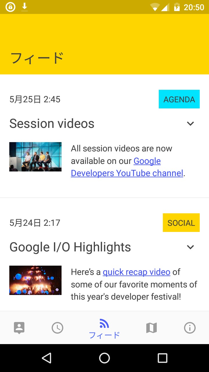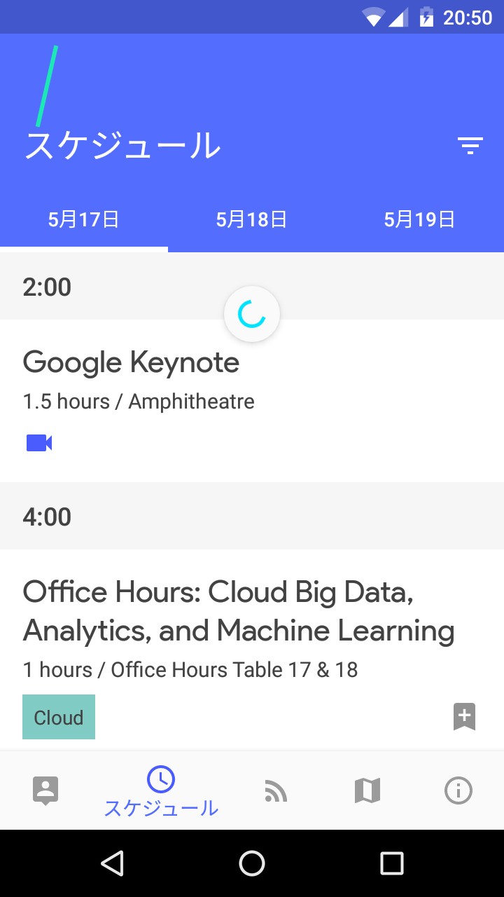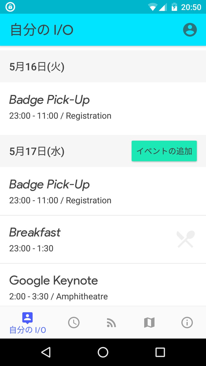 「Google I/O 2017」は、アプリ画面下部のタブを切り替えて操作します。