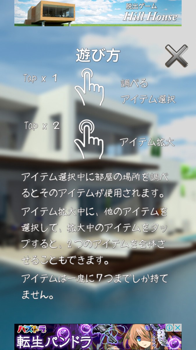 見つけたアイテムは、組み合わせないと使用できないことがあります。何かが不足しているアイテムを見つけたときは、組み合わせれるアイテムを探しましょう。アイテムの組み合わせ方法は、まず一つ目のアイテムをタップして拡大させます。次に2つ目のアイテムを選択後、拡大中のアイテムをもう一度タップすると組み合わせが完了です。