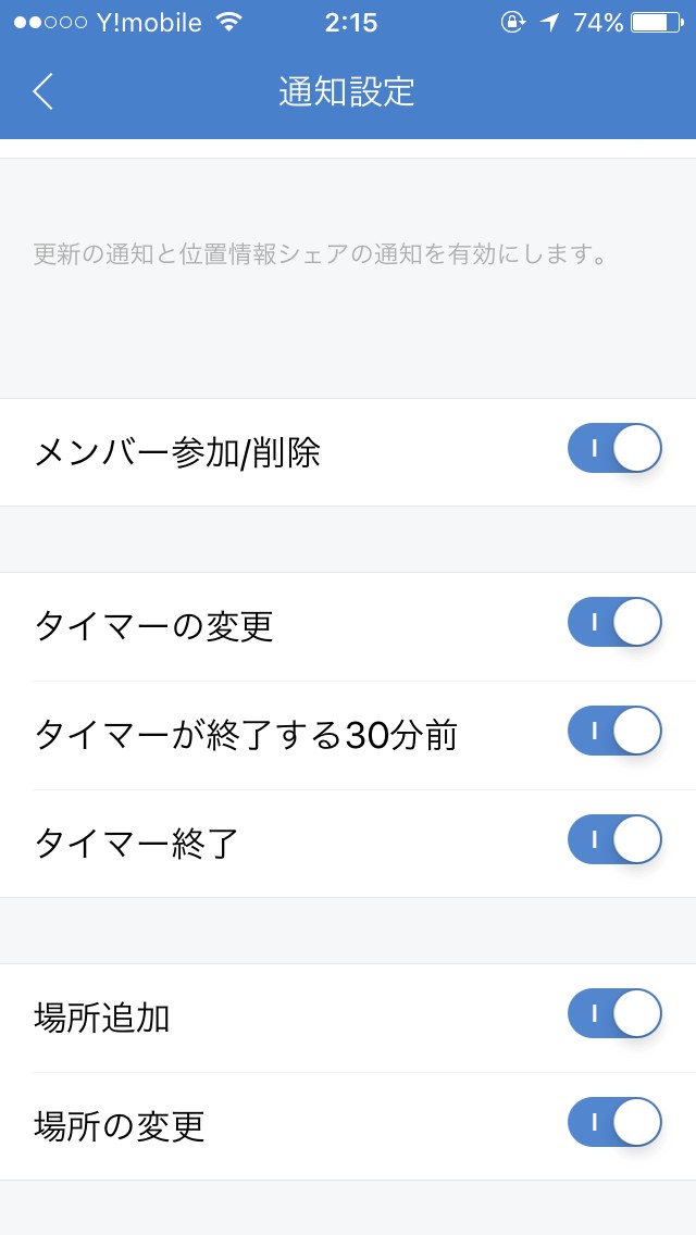 アプリへのメンバーの登録や脱退などシェア時間のタイマーの終了など基本的な通知はもちろん、設定した場所の追加や変更の通知も設定できます。