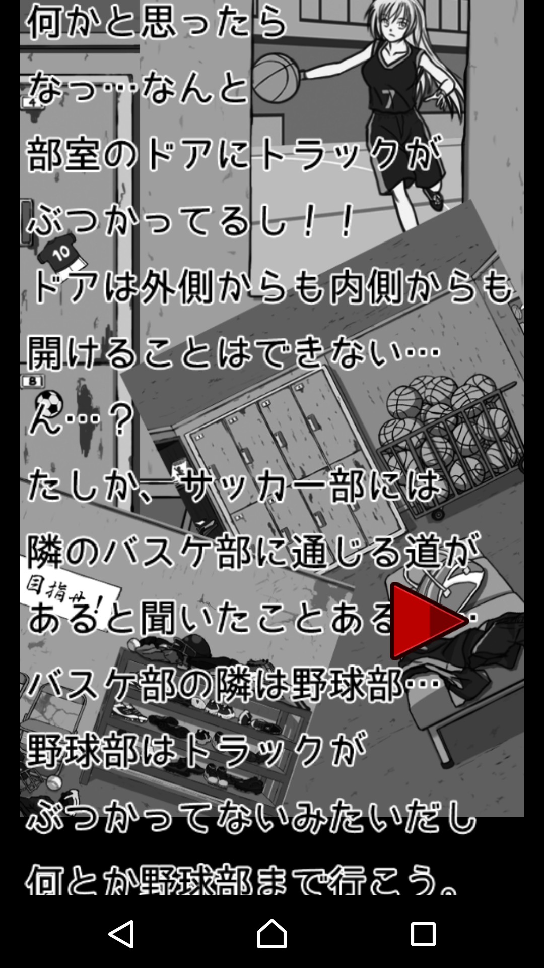 何気なく立ち寄ったサッカー部の部室(ここですでに意味がわかりません(笑)。部員でもないらしいのに何故!?)。とりあえず立ち寄ったという事実はそれとして認めることとして、その状態でサッカー部の部室のドアにトラックが衝突(!)して、扉は開かなくなってしまいました。どうやら被害は隣のバスケ部部室にも及んでいるようです。さらにその隣の野球部の部室には、どうやらトラック衝突の影響はない模様…。