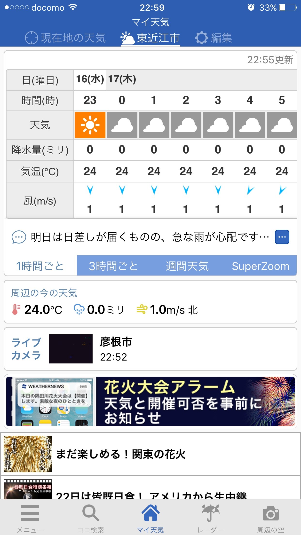 他にも、曇りのち雨の予報。いつ雨が降り出すのかわからない方などいるでしょう。このアプリのもう一つの魅力に時間の間隔が5分毎の雨雲レーダーを搭載し、いつ頃降り出すかを正確に予測します。しかもユーザーがリポートするみんなで作る天気というサービスがあるので実際の今の天気がわかるので正確さは抜群でしょう。