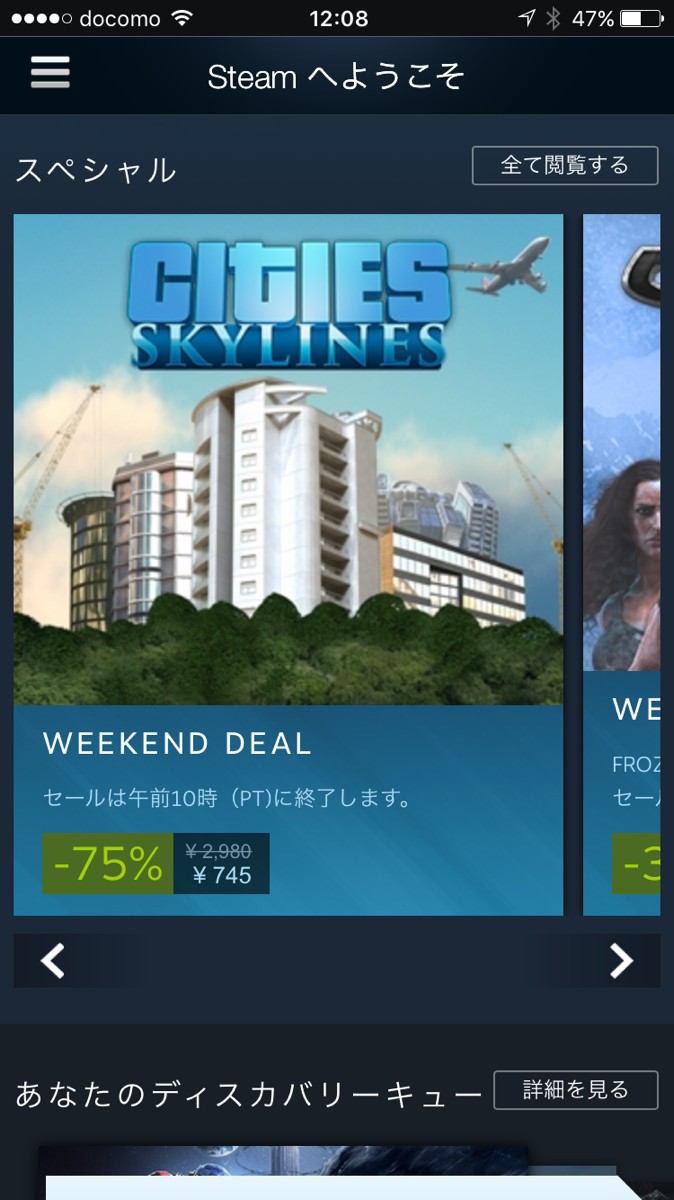「Steamガード」「確認」「フレンド」「通知」「ストア」「コミュニティ」「あなたとフレンド」「ライブラリ」「サポート」です。「あなたとフレンド」ページでは、フレンドが今ゲームをしているのか、していないのかなどのアクティビティをチェックできたり、フレンドとのグループを作成できたり、チャットできたりします。「ストア」ページを開くとトップ画面にセール情報が表示されているので、外出先でも時間限定のセール価格でのゲーム購入が可能です。