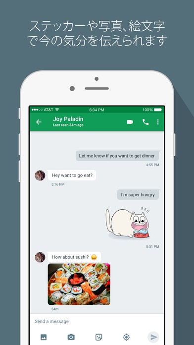 ところです。メールだと「何通も連続で送信するのは気が引ける」という人も多いでしょう。このアプリはチャット形式なので、気兼ねすることなく楽しむことができます。しかも、メッセージの送受信だけではなく、電話やビデオ通話も無料で利用できるので驚きです。グループチャットは150人まで対応しており、ビデオ通話は同時に10人まで会話ができます。大人数に対応しているので、サークルや会社の連絡ツールとして利用するのもおすすめですよ。写真やステッカーを送信して、友達や家族とのコミュニケーションとして利用してもいいかもしれません。便利な機能がたくさん詰まった「ハングアウト」、ぜひ試してみてくださいね。