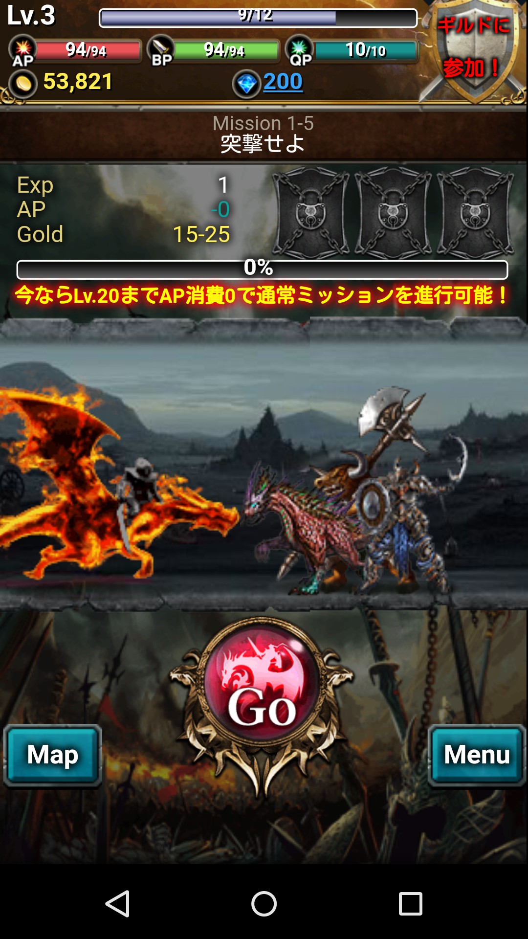 ミッション進行はよくあるソシャゲと同じなので割愛。Goボタンを押してポチポチと達成度を高めていきますが、ちょっとだけ進化したシステムになっています。