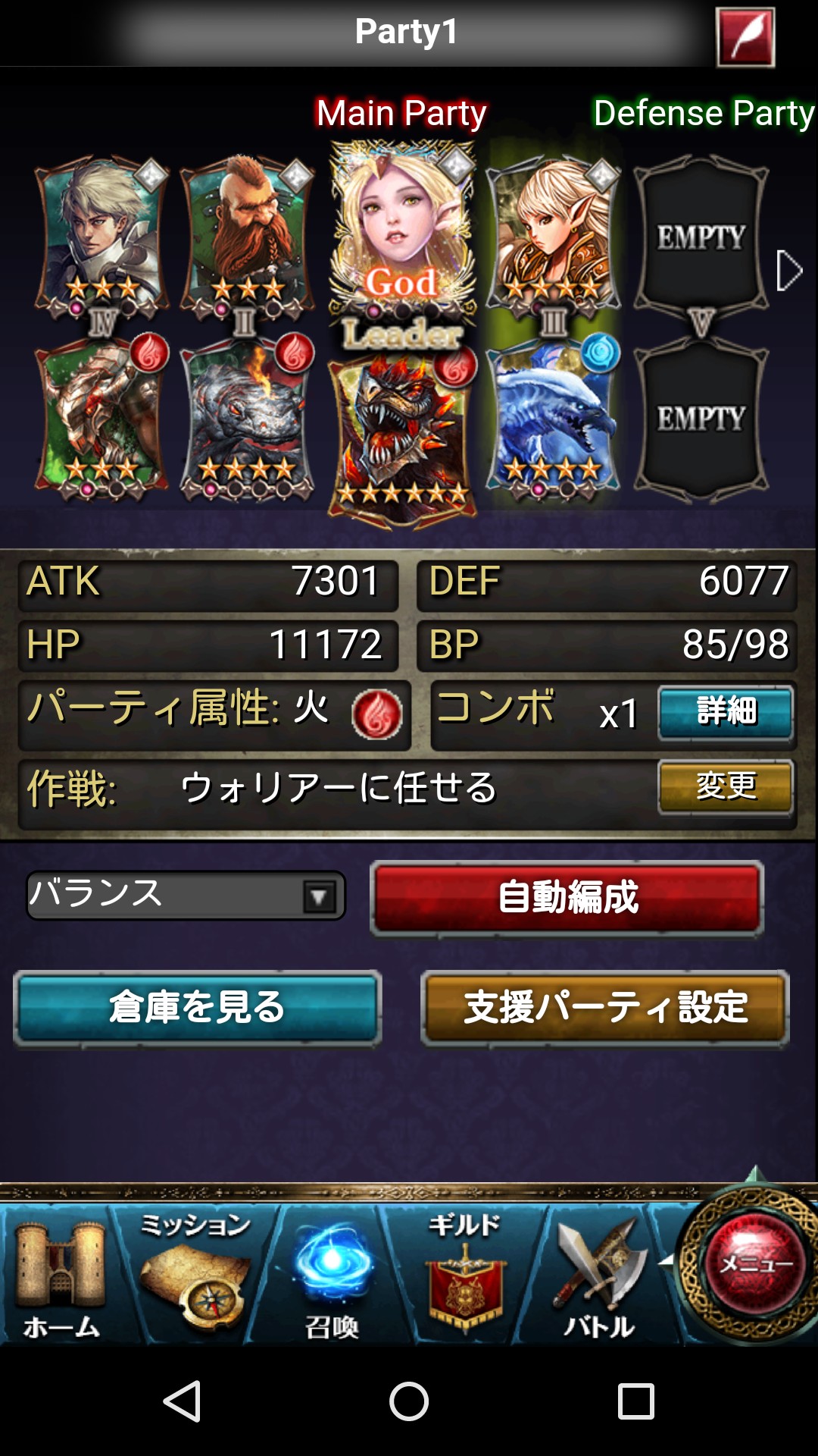 ボスやプレイヤーとのバトルは編成したパーティーの総力戦。ウォリアーとドラゴンが1セットで最大5人まで編成できます。組み合わせによってステータスにボーナスがつくので、
