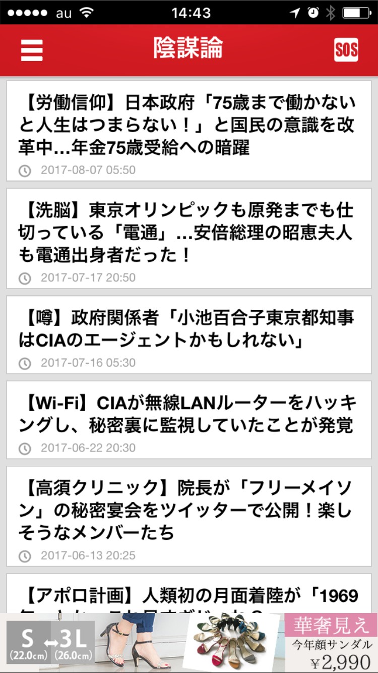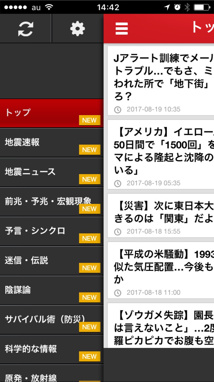 「天変地異のまとめ速報~天地混沌の兆」を実際にダウンロードして使ってみました。ダウンロードすればすぐにトップ画面から情報をチェックできます。メニューから地震情報や前兆現象、予言・シンクロなど、項目ごとの情報が見れるようになっているのが特徴的です。新しく情報が入ったものにはNEWマークがつくので、最新のものをチェックできます。東日本大震災以来気になる原発・放射線の情報や、食の安全に関する情報も閲覧可能です。地震関連だけではなく、火山・噴火といった不測の事態に備える情報もあります。どの情報ページを見ていても、右上にあるSOSマークをタップすると、SOSアラートの機能が使えて安心です。ホイッスル音、ブザー音、ベル音を鳴らすことができ、音量も同時に調整できます。夜間に役立つSOSライト機能もついており、モールス信号点滅や通常点灯で居場所を知らせることができます。いざという時に備えていれば、情報のキャッチにもSOSにも役立ってくれる便利なアプリです。
